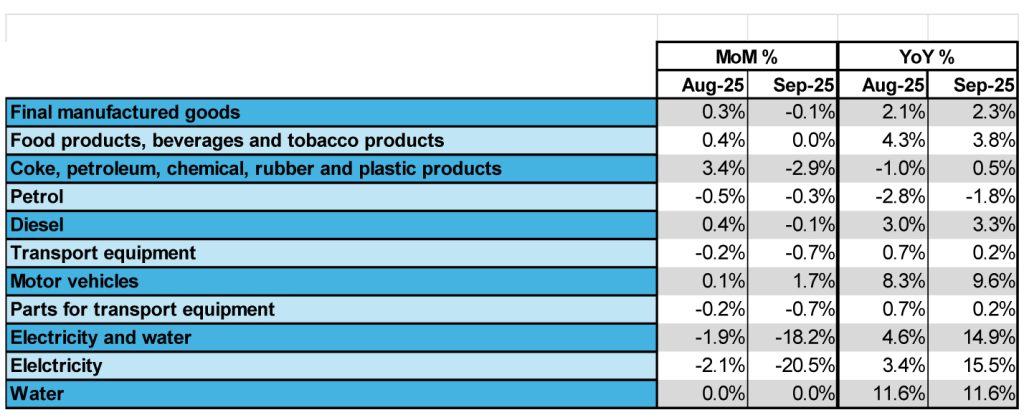 The previous deflationary trend in producer inflation appears to have ended, with only petrol prices continuing to decline—petrol prices decreased by 1.8% on an annual basis in September 2025.