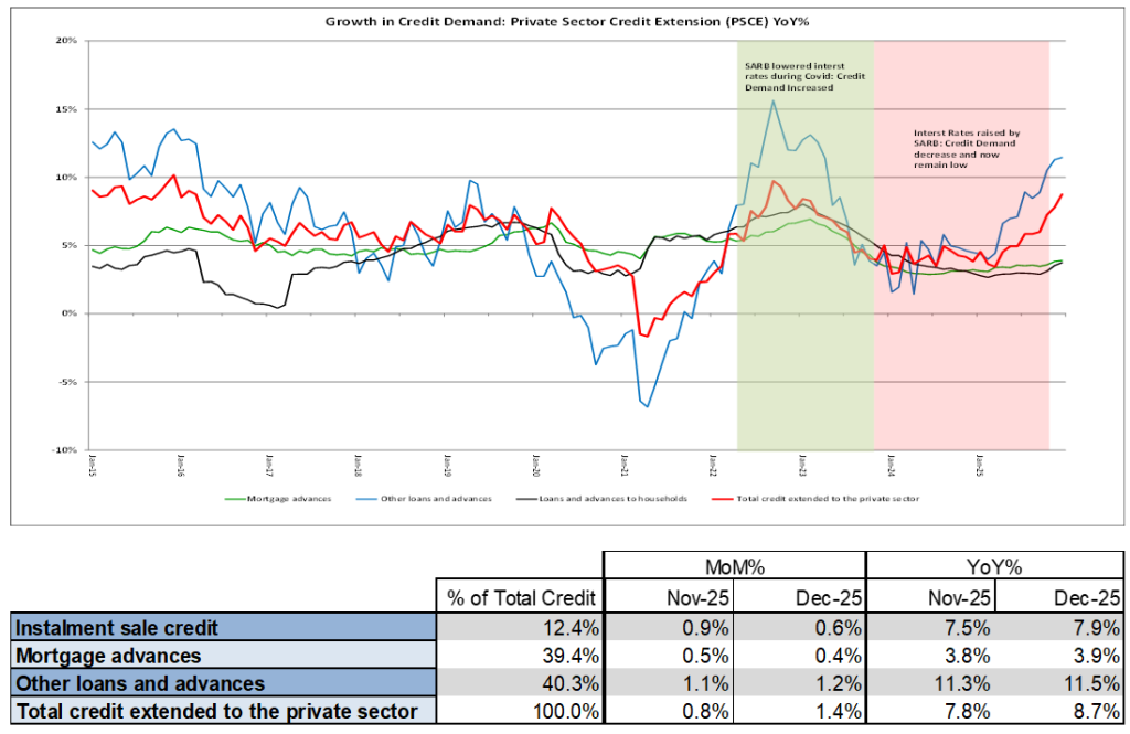 In December 2025, the demand for credit grew by 8.7%, slightly surpassing the market’s expectation of 8.0% for the month. Since interest rate cuts began in September 2024, overall credit growth has accelerated, with most subcategories experiencing increases, especially following the South African Reserve Bank’s decision to lower interest rates.