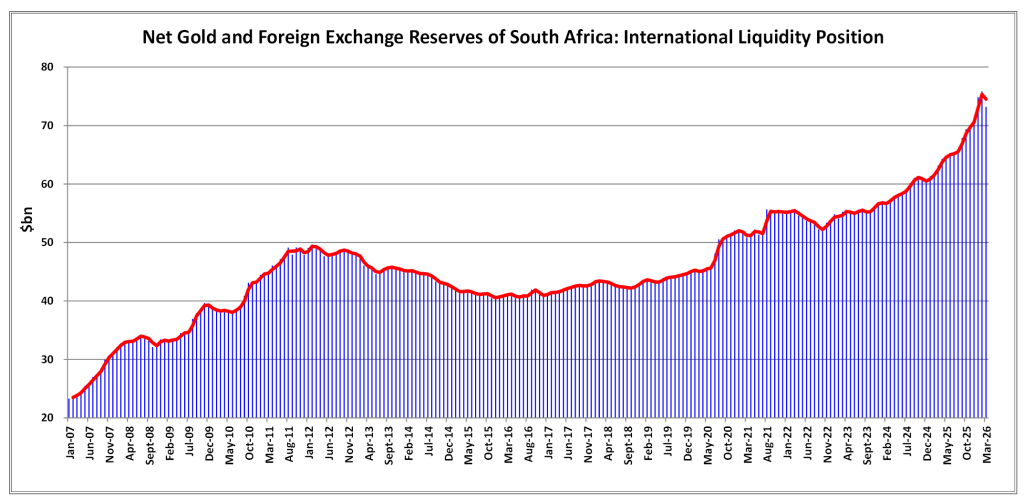 In USD terms, foreign reserves decreased in March 2026 compared to the previous month. The Reserve Bank sold some US Dollars in open market operations as the Rand lost value against the US Dollar throughout March, thereby impacting South Africa’s net international liquidity position at that time.