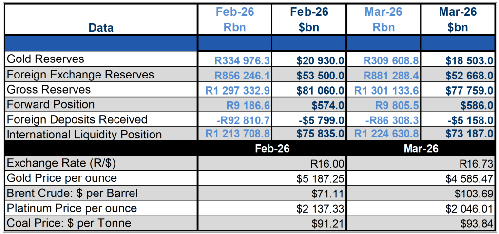 South African Gold and Foreign Exchange Reserves for March 2026