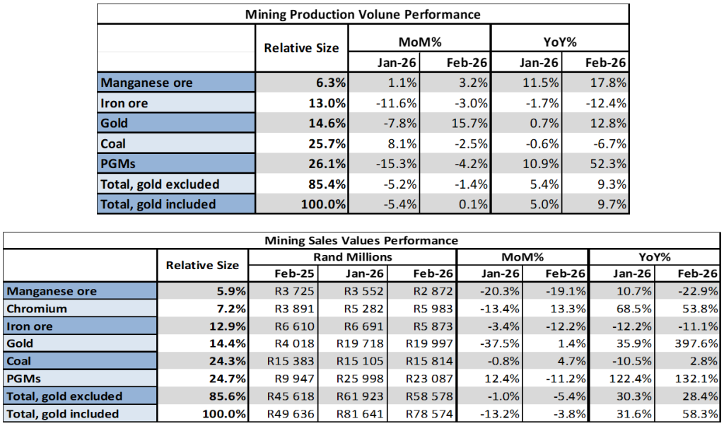 In February 2026, South Africa’s mining activity rose 9.7% following the revised 5.0% increase recorded in January 2026. This growth was predominantly driven by: