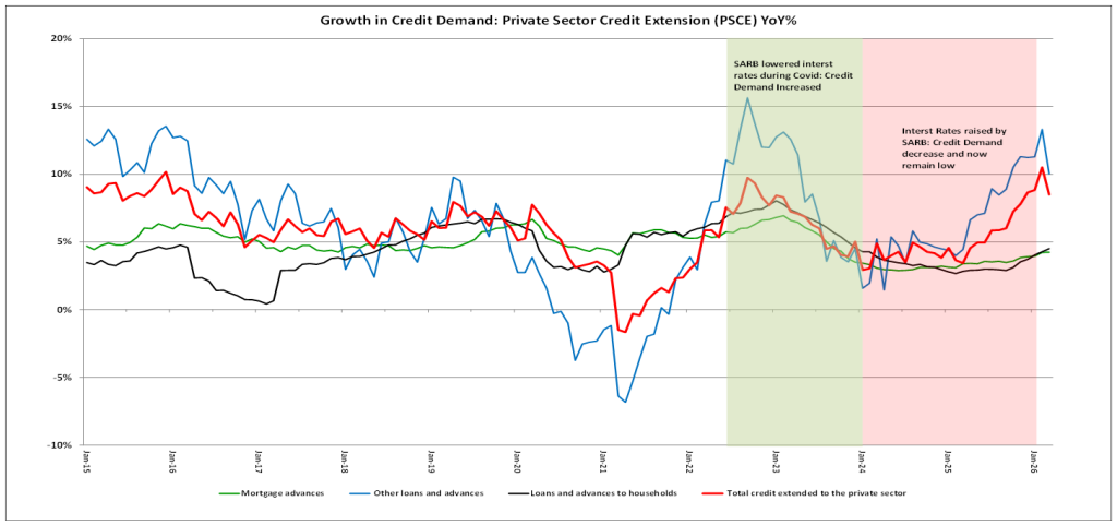 In March 2026, credit demand grew by 8.5%, slightly below the market’s expectation of 9.0%. Since interest rate cuts began in September 2024, overall credit growth has accelerated, with most subcategories experiencing increases, especially following the South African Reserve Bank’s decision to lower interest rates.