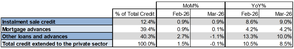 In March, instalment credit sales increased again by 0.9% from the previous month, marking an annual growth of 9.0%. Over the past two years, consumers have increasingly relied on short-term credit to manage rising living costs, as shown by an 10.0% increase in other loans and advances, slightly down from 13.3% in February 2026 figures.